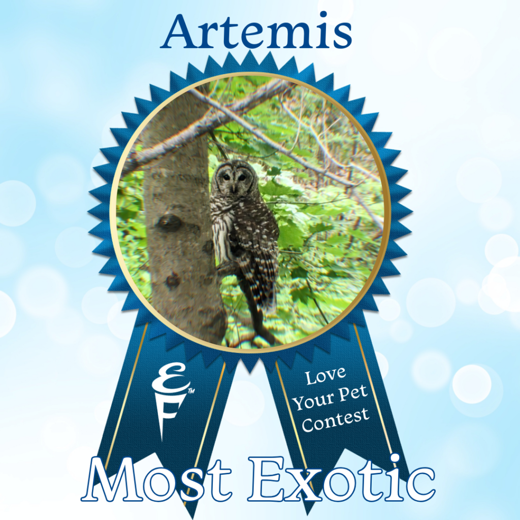 Artemis is a rebel and still won’t land on my shoulder. Artemis enjoys when I lure birds to our windows with bird seed so it can pick off any that hit said window. Artemis is one scrappy owl and is always watching us from a distance.